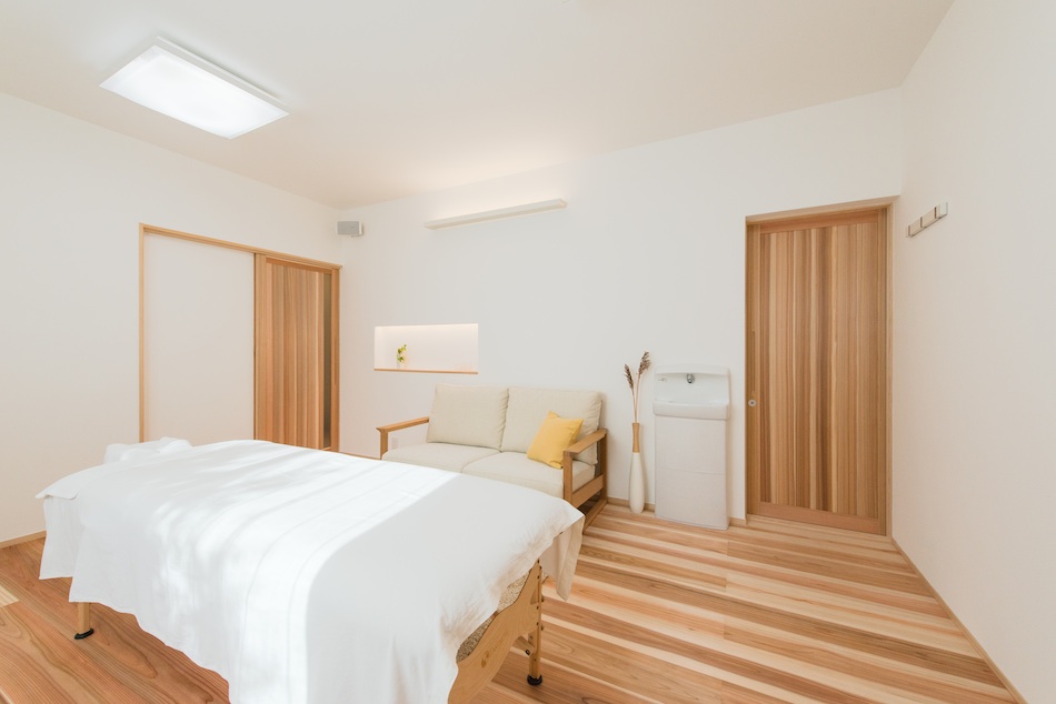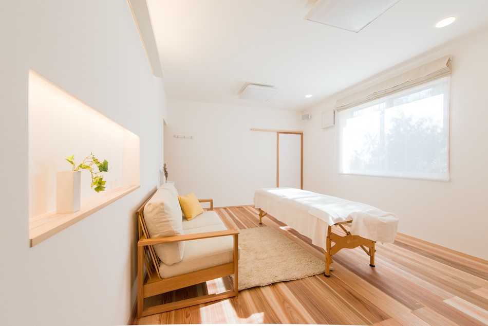明るい清潔なお部屋で施術を受けていただけます。床も壁も自然素材を使用しており、シックハウスの心配もありません。